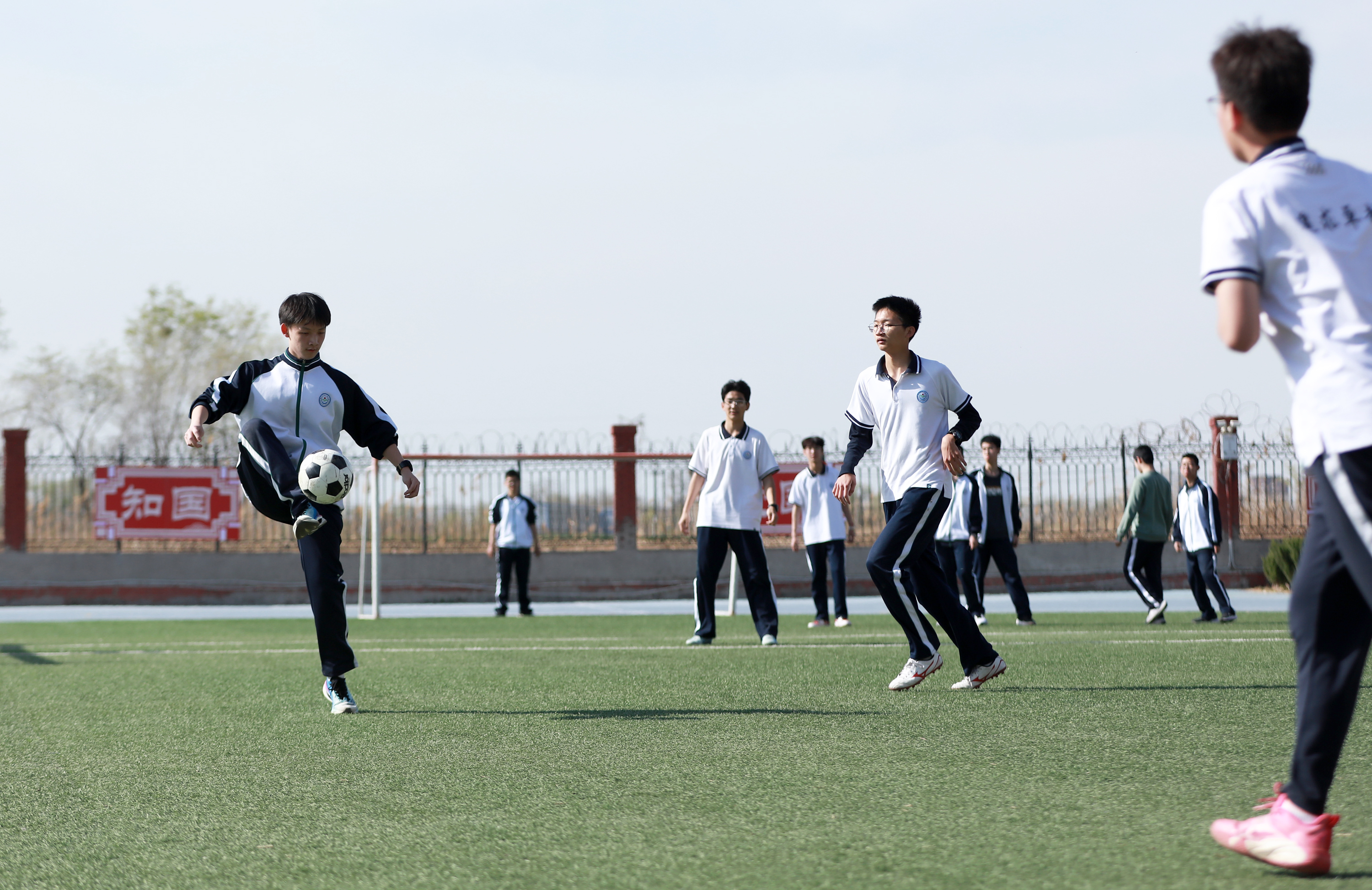 春日的校園綠茵場上,學(xué)生們奔跑如飛,追逐著滾動的足球,滿是蓬勃的青春活力。