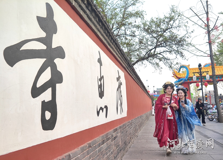 正定街道上、紅墻下,身著漢服、頭戴簪花的游客隨處可見。河北經(jīng)濟日報記者 煙成群 攝