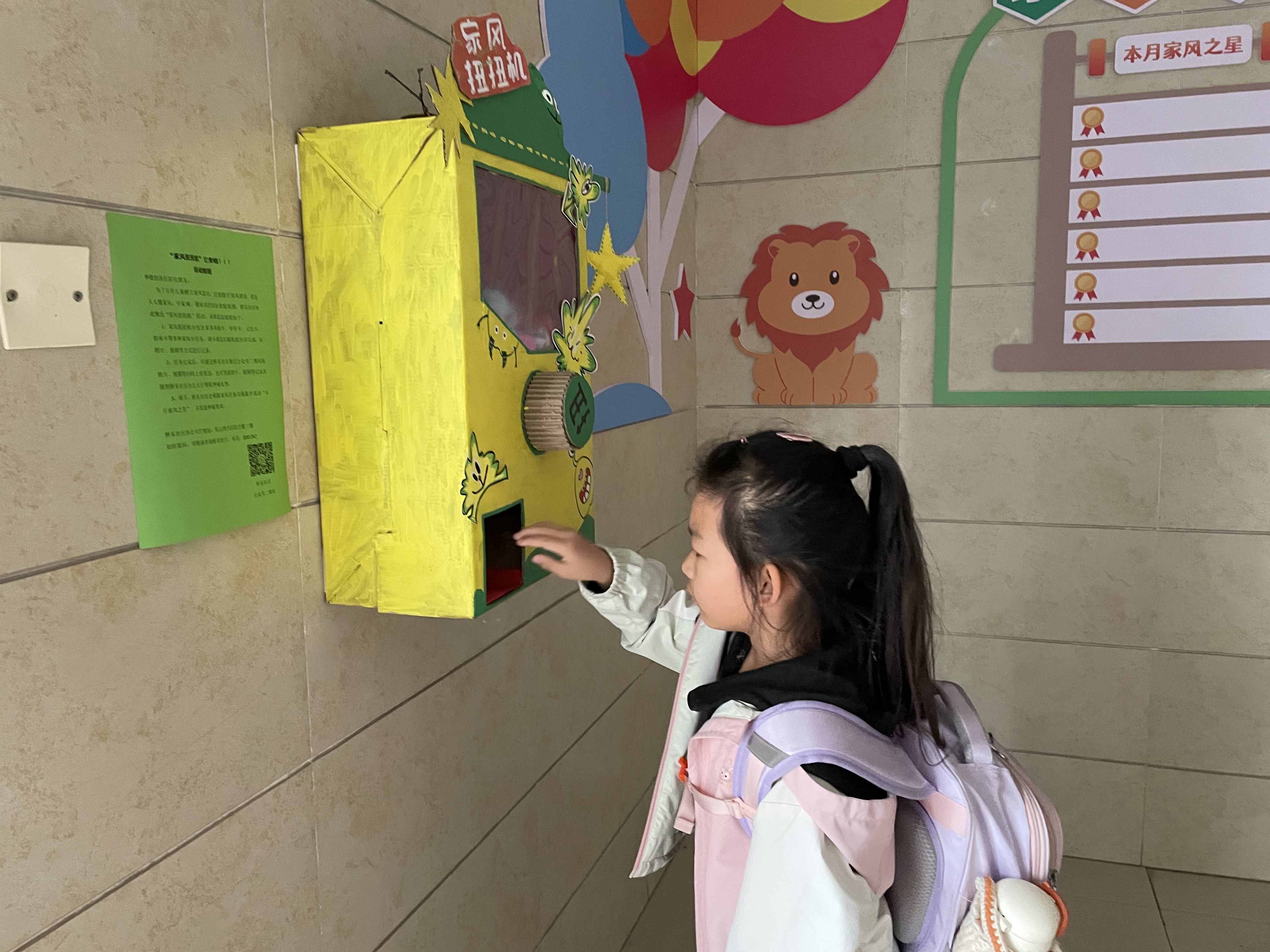 4月15日,依云灣小區13號樓二單元樓道內,幾名剛放學歸來的小學生正圍聚在一臺由廢紙箱DIY而成的彩色扭扭機旁,轉動齒輪抽取“家風任務卡”。隨著齒輪“咔嗒”聲接連響起,一個個含有“幫爸爸媽媽做一次家務”“對爸爸媽媽說一聲我愛你”等任務卡片的小彩球掉落進孩子們的手中,引得大家雀躍不已,“走走走,咱們趕緊回家做任務去!”