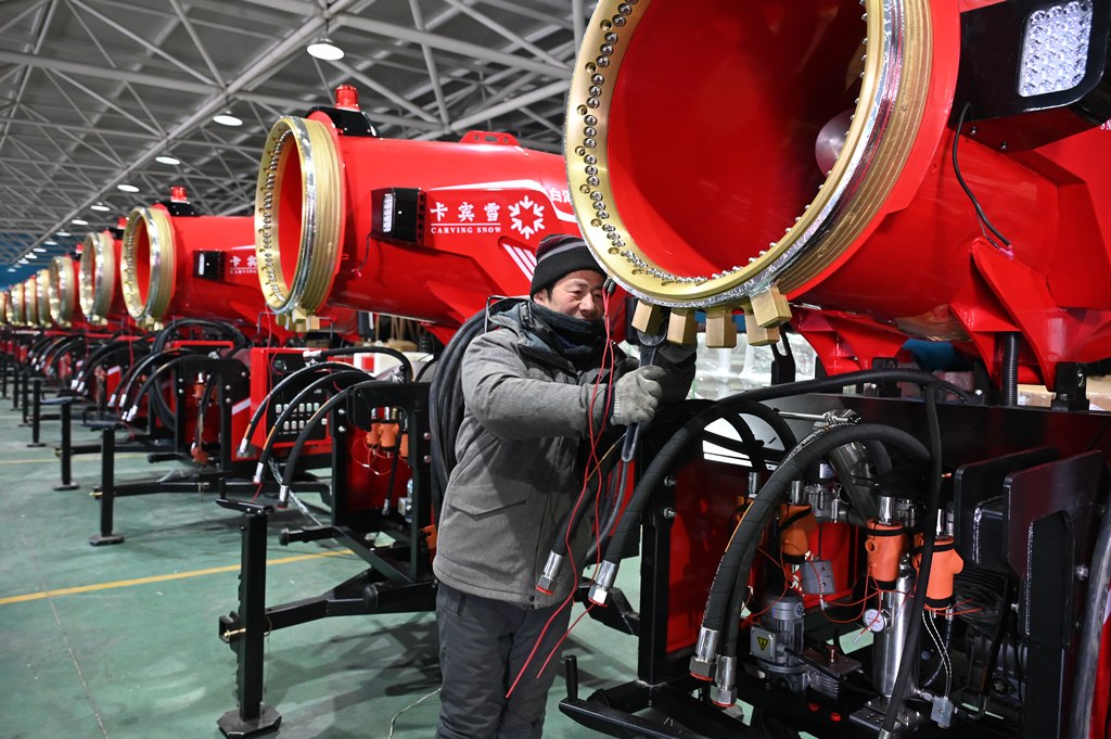 張家口卡賓滑雪裝備制造有限公司工人在生產車間組裝造雪機?!。ㄙY料圖片)