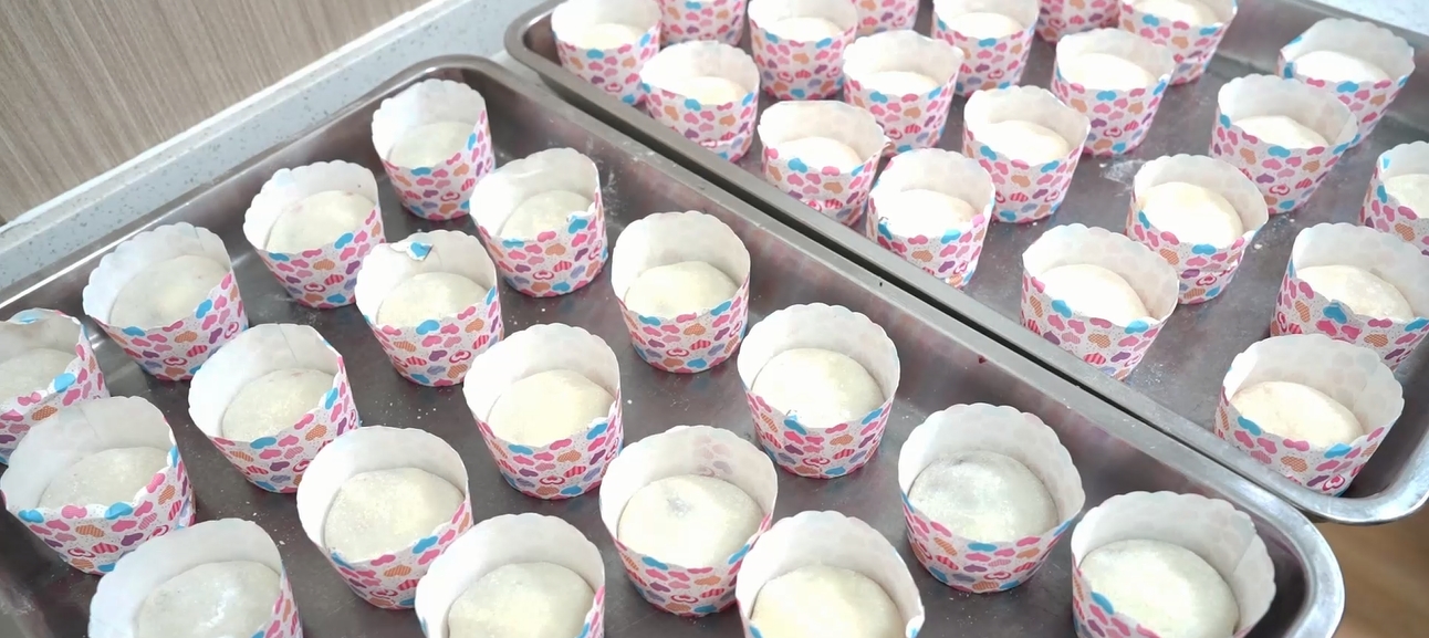 最考驗(yàn)技巧的當(dāng)屬包制過程。大家將搟好的雪媚娘皮放在手上,放入餡料后捏合收口,再倒扣成型放在模具杯子里。雖然初次嘗試時(shí)有人面皮開裂,有人餡料溢出,但在互相幫助下,一個(gè)個(gè)圓滾滾、白胖胖的雪媚娘陸續(xù)誕生。