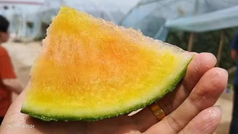 郭景彥介紹說,這個品種叫彩虹西瓜,因其瓜肉瓤色紅橙、乳黃相間,橫切面帶有隱約的花朵形狀,縱切剖面似一道美麗的彩虹而得名。彩虹西瓜瓜皮薄,可食率在95%以上,其中瓜心含糖高達13.9%,深受消費者喜愛。