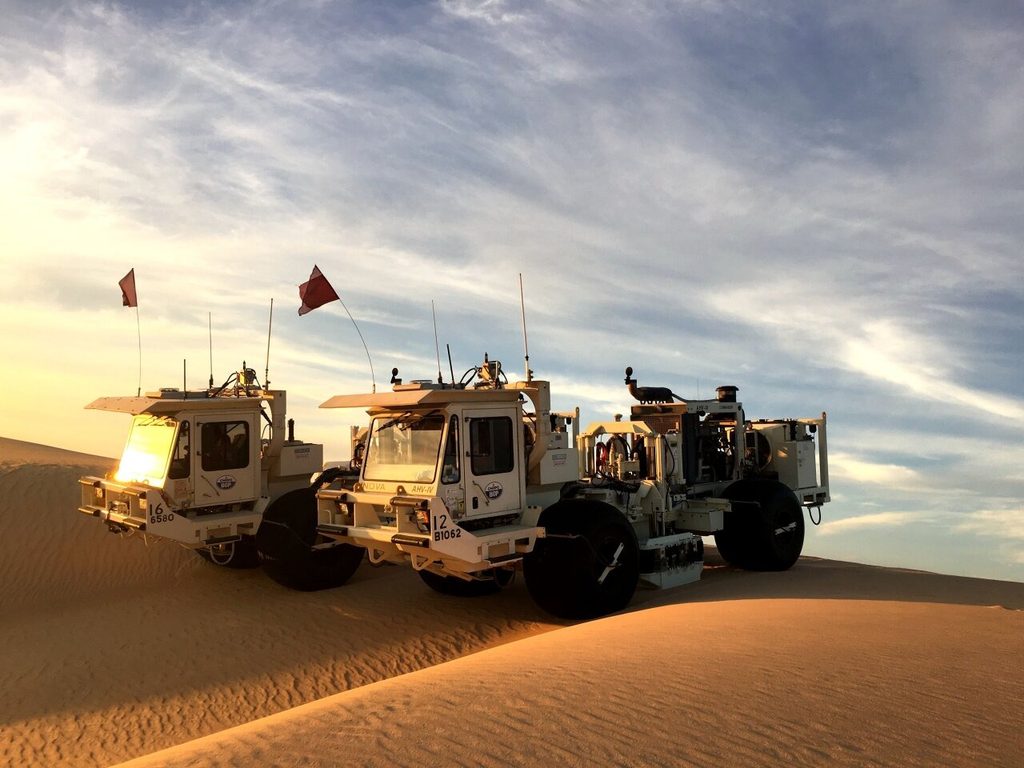 2017年1月14日,東方物探研發(fā)的可控震源車在魯卜哈利沙漠中作業(yè)。 東方物探供圖