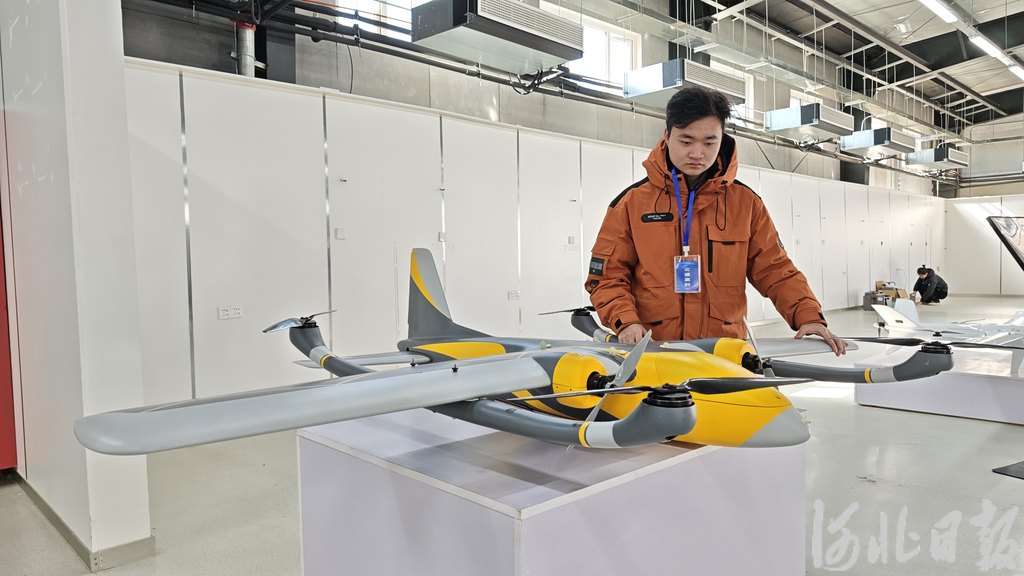 2月23日,安新縣無人機創新基地內,北通(雄安)航空科技有限公司工作人員介紹新款無人機用途。河北日報記者曹錚攝