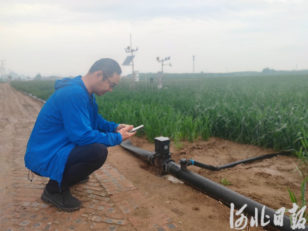 4月22日,在鹿泉農業節水試驗示范基地,工作人員通過手機App,打開電子水閥,對小麥進行灌溉。河北日報記者 王璐丹攝