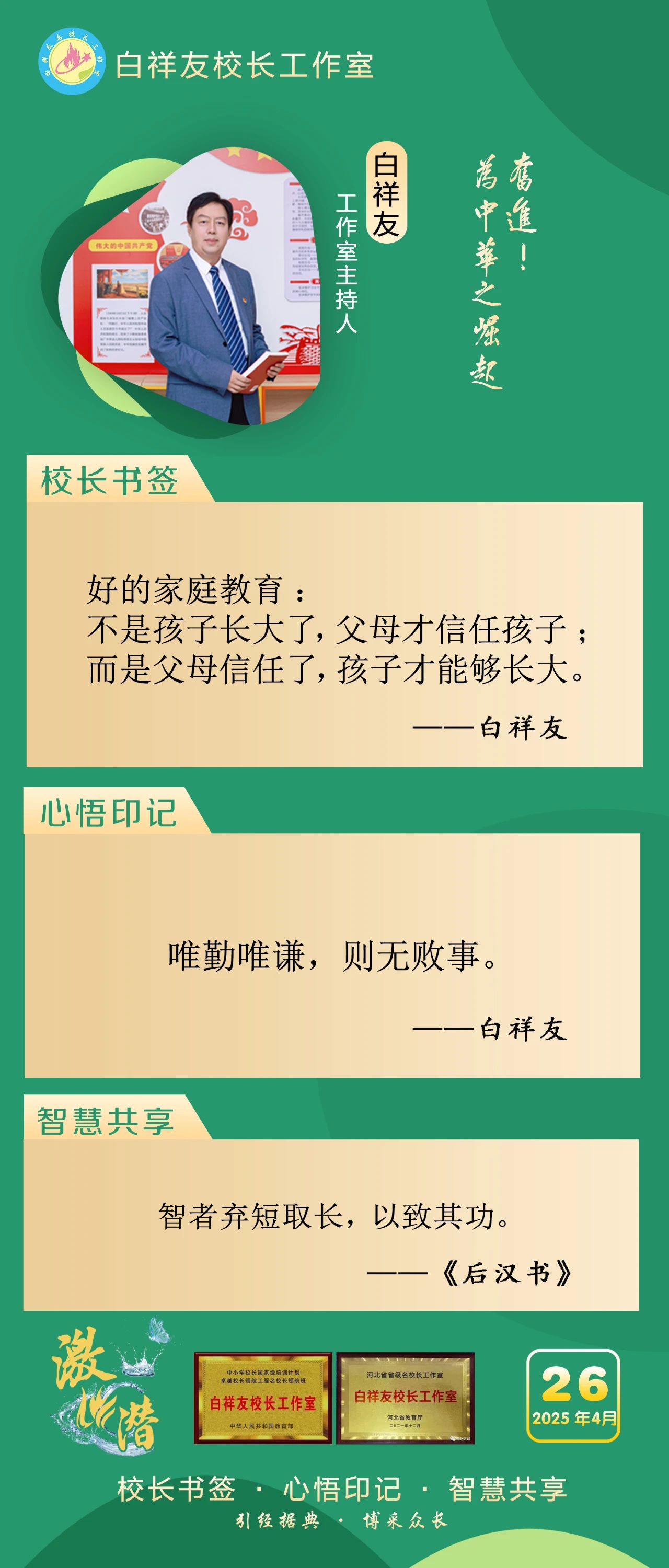 “白祥友校長工作室”成立于2019年4月,是教育部“國培計劃”中小學名校長領航工程、河北省首批名校長工作室,目前省內外成員校56個。工作室堅持“資源共享、智慧共融、互助共贏”理念,已成為思想碰撞的交流場,資源共享的品牌站,成果展示的輻射源。