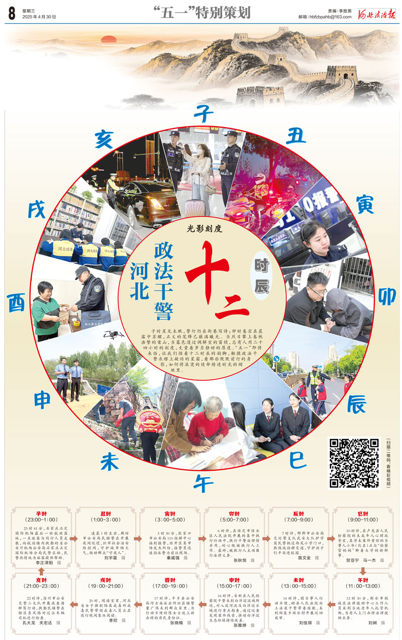 子時星光未眠,警燈仍在街巷寫詩;卯時卷宗在晨露中蘇醒,正義的筆鋒已蘸滿曦光。當(dāng)烈日攀上卷帙浩繁的案山,當(dāng)暮色漫過調(diào)解室的窗欞,總有人用二十四小時的刻度,丈量著歲月靜好的厚度。“五一”即將來臨,讓我們循著十二時辰的韻腳,觸摸政法干警衣襟上凝結(jié)的星霜,看那些默默前行的身影,如何將滾燙的使命繡進時光的褶皺里。