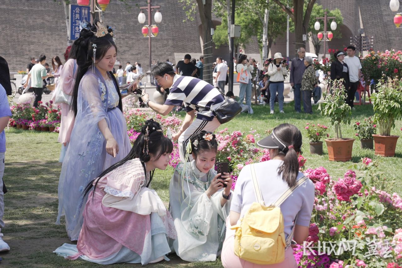 上午10點,正定古城“非遺大巡游”在南城門正式開啟,震撼的常山戰鼓、中幡表演等引得游客掌聲不斷。城樓旁邊的公交站布置了大片花墻,供游客拍照打卡,選擇在今天登記結婚的新婚夫婦也特意來到花墻處拍攝“領證紀念照”,與大家共同分享愛情甜蜜。遠處的南廣場上,正在舉辦的“花開正定·滿城芳華”全民賞花季更是姹紫嫣紅,百花齊放,不少身著古裝的“小哥哥”“小姐姐”在拍照打卡,成為正定古城一道亮麗的風景線,也讓正定多家漢服妝造店生意火爆。