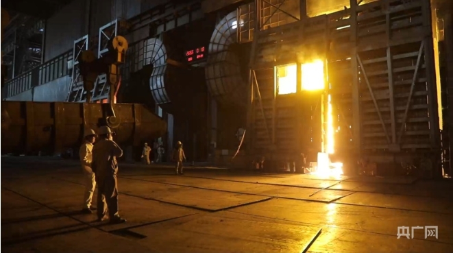 煉鋼轉爐車間生產現場,鋼花飛舞(央廣網記者 王藝霖 攝)