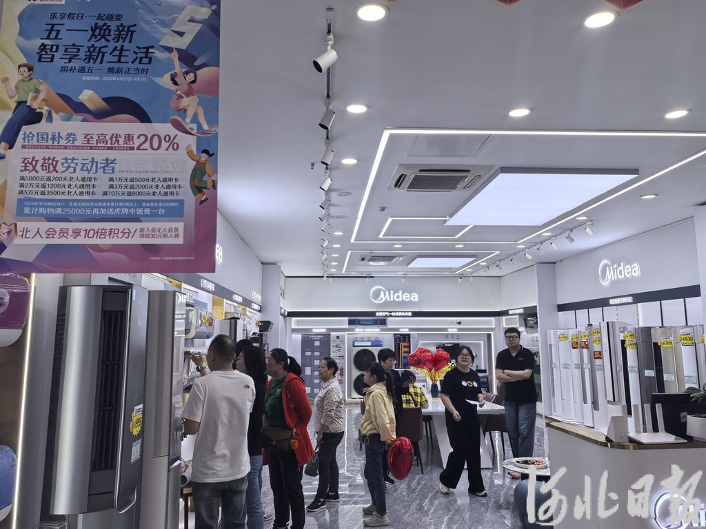 5月1日9時30分,石家莊市北國電器新百店比往常提前半小時開門迎客。走進賣場,“政府補貼”“五一煥新”的標識格外醒目,節能、智能、健康的空調新品成為主角。