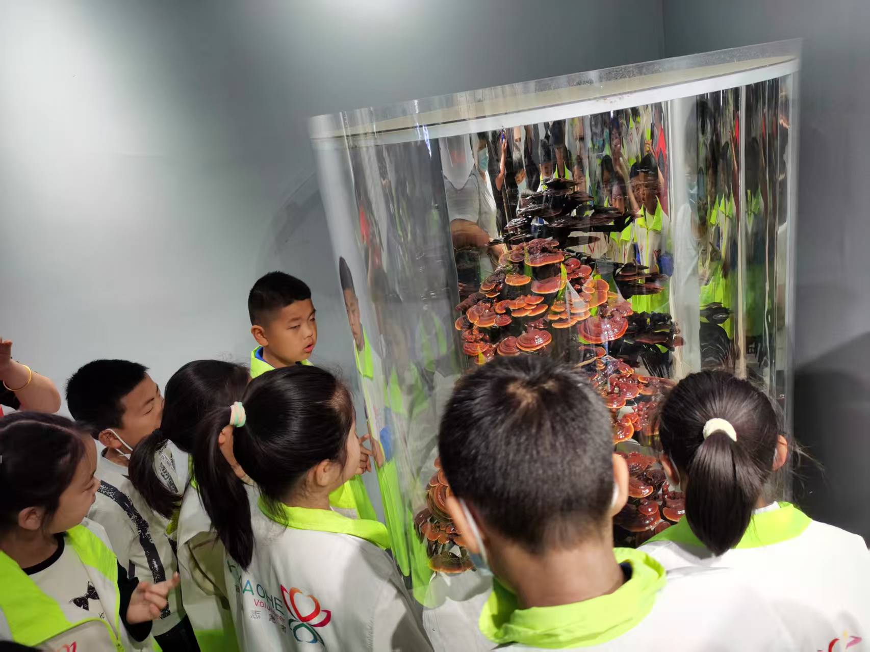 “大家都知道靈芝?靈芝是一種中藥材,在日常生活中可以燉肉、泡酒、泡水等”跟隨文化產(chǎn)業(yè)園負(fù)責(zé)人張國偉的講解,同學(xué)們首先來到靈芝文化展廳。展廳內(nèi),大大小小的靈芝盆景,層次分明、造型獨(dú)特,有的像姿態(tài)華美的“孔雀”,有的如振翅欲飛的“仙鶴”……不同種類、不同形態(tài)特征的靈芝及相關(guān)展示資料訴說了,靈芝的古今傳奇、靈芝在傳統(tǒng)文化中的地位和意義、靈芝的生長習(xí)性及生長方式。從神話傳說到帝王祥瑞,從仙草傳奇到科學(xué)實(shí)證,在二十分鐘的沉浸式光影之旅中,同學(xué)們似穿越時空長河,感受靈芝如何從“神話符號”蛻變?yōu)椤敖】得艽a”,驚嘆靈芝文化的博大精深。
