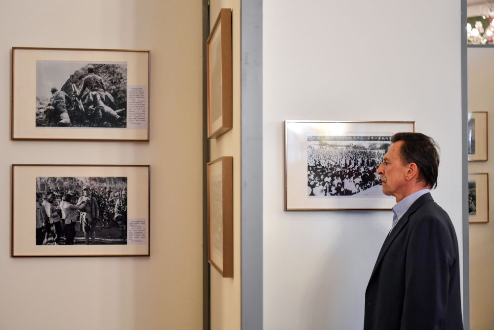 ??4月18日,在俄羅斯首都莫斯科,嘉賓參觀紀(jì)念中國(guó)人民抗日戰(zhàn)爭(zhēng)暨世界反法西斯戰(zhàn)爭(zhēng)勝利80周年圖片展。新華社記者 曹陽(yáng) 攝