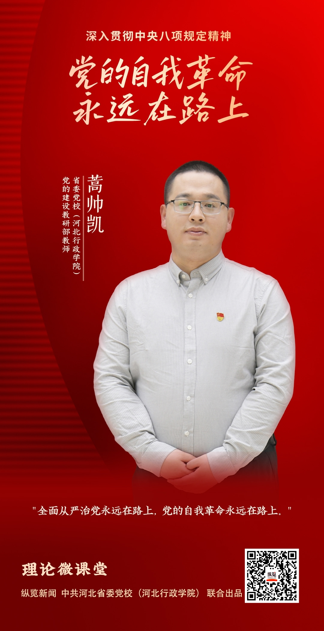 落實中央八項規定精神是新時代推進全面從嚴治黨的一項系統工程。第四期,一起來看省委黨校(河北行政學院)黨的建設教研部教師蒿帥凱主講的《黨的自我革命永遠在路上》。