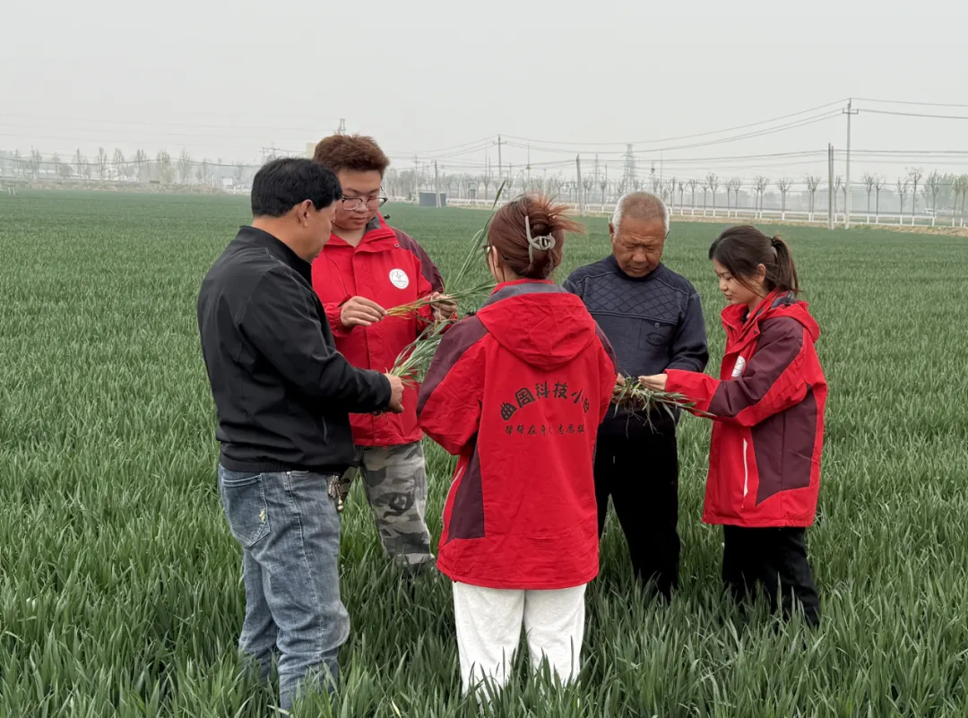 曲周科技小院的學生們和當地農戶檢查麥子生長情況(攝/河北青年報記者宋敬)