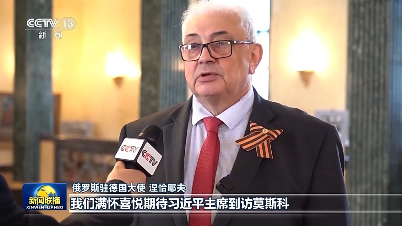 俄羅斯駐德國大使 涅恰耶夫:我們滿懷喜悅期待習近平主席到訪莫斯科。蘇聯人民和中國人民在二戰中付出了巨大犧牲,最終贏得世界反法西斯戰爭勝利。習主席曾引用俄歷史學家克柳切夫斯基的話說,如果喪失對歷史的記憶,我們的心靈就會在黑暗中迷失,我認為習主席觀點非常正確。每個國家、每個民族都必須了解歷史,沒有歷史就沒有真正的未來,我對兩國人民擁有良好的關系和美好的未來充滿希望。