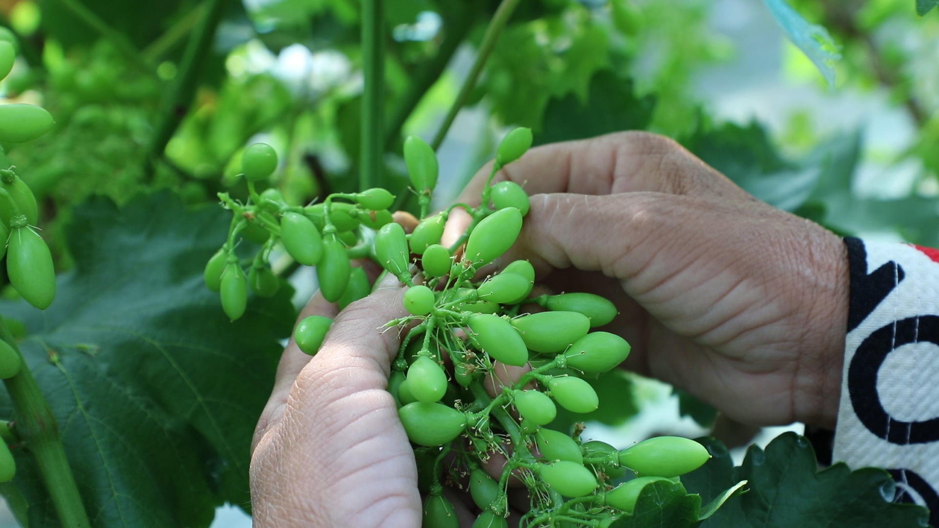 “疏粒是個細(xì)致活,你不能光圖快,現(xiàn)在葡萄還沒長成型,顆粒小,你必須要把每串葡萄都看到,把壞果、小果剔除掉,才能讓葡萄更好生長。”果蔬工王妨說。