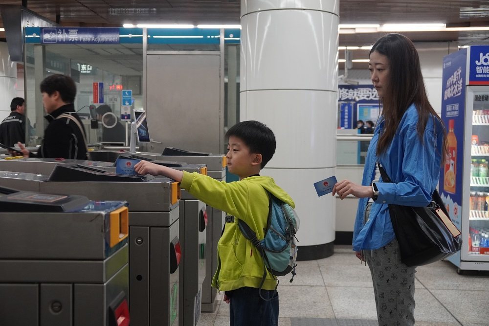 5月1日,在北京地鐵7號線進站口,范芮潔和兒子通過刷社保卡,順利乘坐上北京的地鐵。保定市人社局供圖