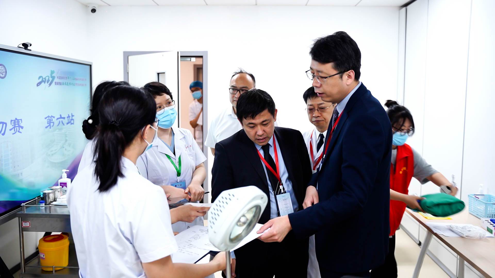 山東大學齊魯醫院胰腺外科副主任、臨床技能培訓中心主任展翰翔擔任總裁判長,在考試現場巡考。