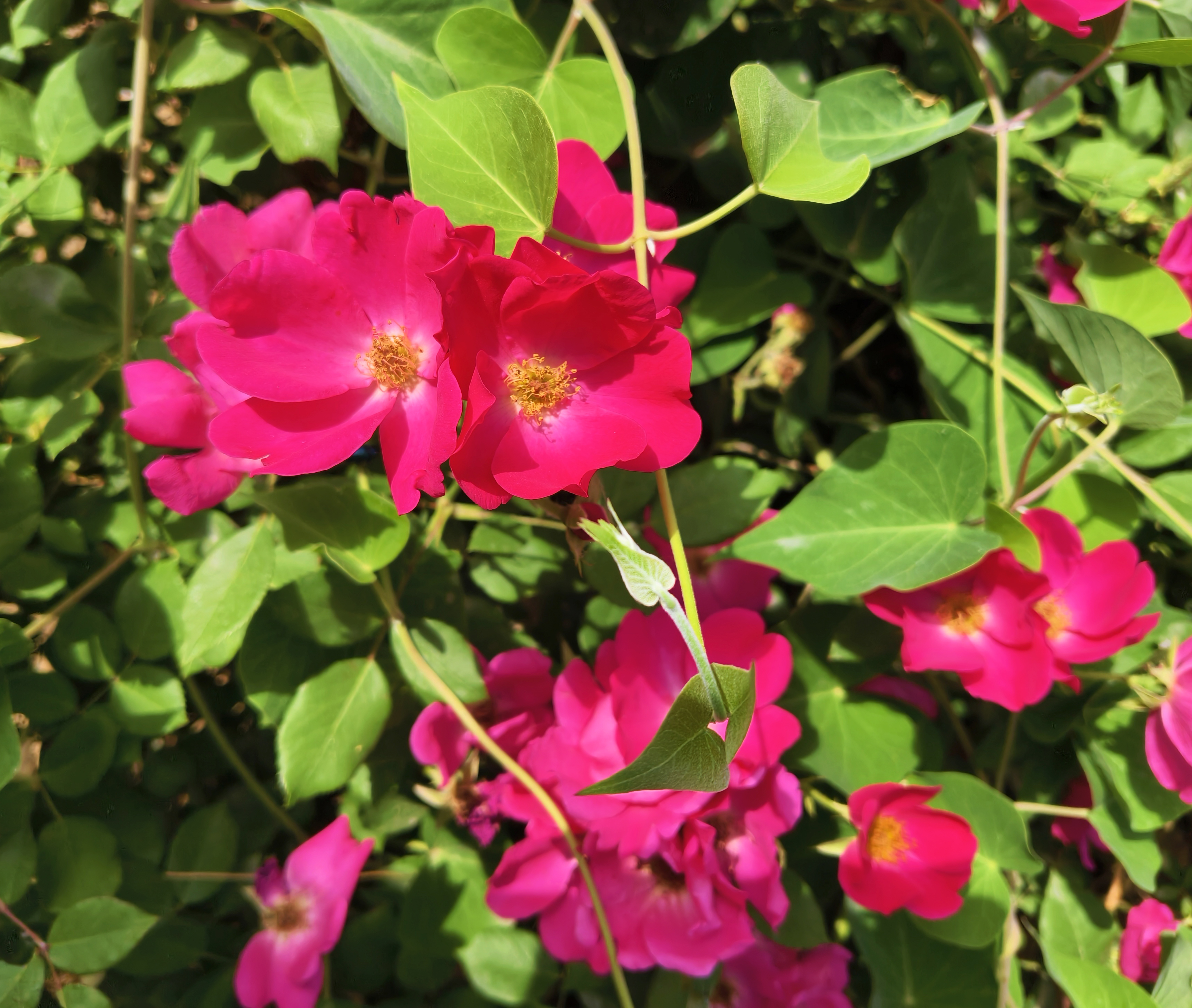 沿著五岔路口漫步,薔薇花如瀑布般傾瀉而下,粉的嬌嫩、白的純潔,層層疊疊的花瓣在微風中輕輕搖曳,像是在訴說著夏日的溫柔。藤蔓沿著圍欄攀爬,交織成花的屏障,濃郁的花香撲鼻而來,令人陶醉。