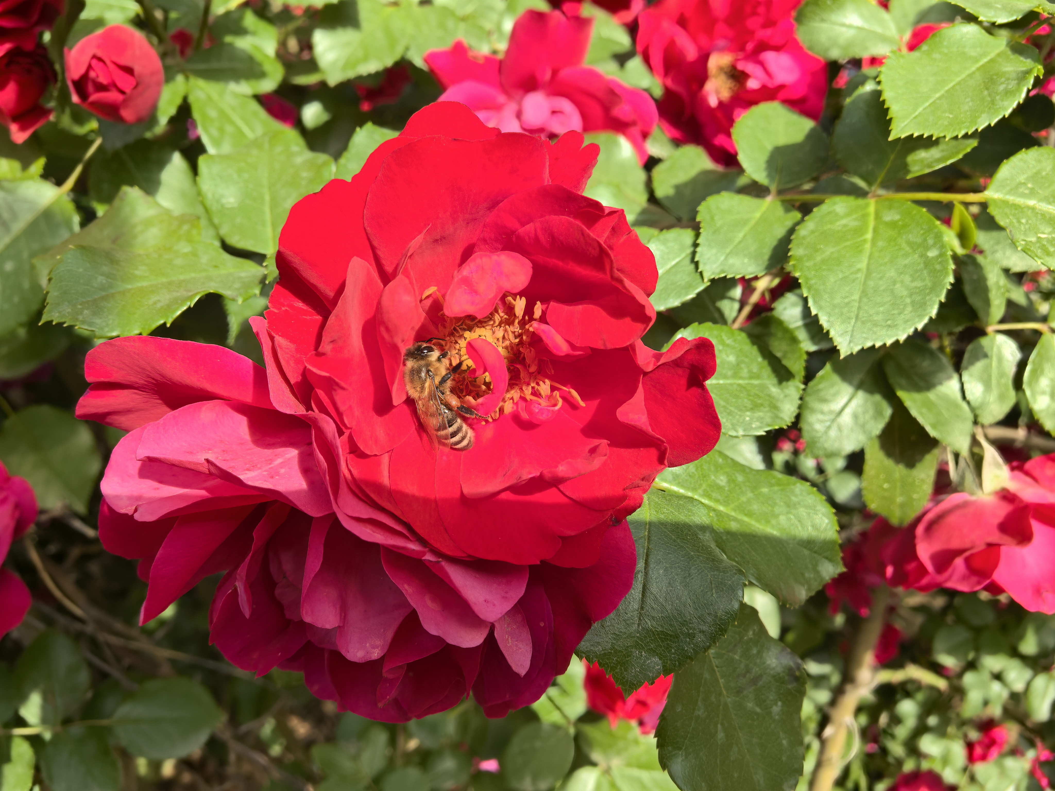 微風拂過,花枝輕搖,花香似被喚醒的精靈,輕盈地穿梭在枝葉間,令人陶醉。蜜蜂與蝴蝶被這迷人的香氣與艷麗的色彩吸引,穿梭其中,忙碌地采著花蜜,翅膀扇動間,又將香氣帶往廣場的各個角落,引得游人紛紛駐足,沉醉在這片如夢似幻的月季花海之中。這里不僅是月季花的天堂,更是人們放松身心、享受美好時光的溫馨之地,承載著無數歡樂與愜意。