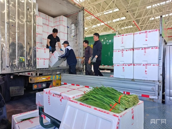 工作人員裝卸新鮮韭菜,發往京津百姓餐桌(央廣網記者 王藝霖 攝)