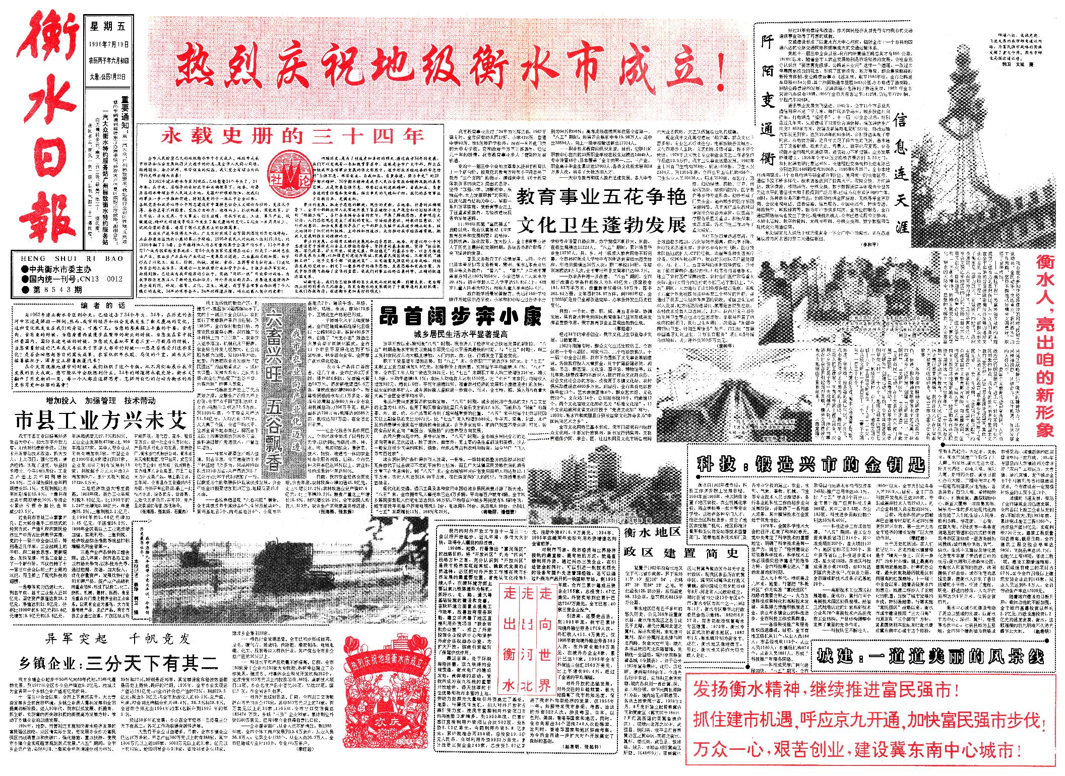 1996年7月19日,《衡水日?qǐng)?bào)》頭版轉(zhuǎn)發(fā)省政府《關(guān)于撤銷衡水地區(qū)設(shè)立地級(jí)衡水市的通知》,向廣大市民報(bào)喜。從地區(qū)升級(jí)為地級(jí)市,意味著更多政策與資源要素將向衡水匯集。撤地建市,打響了這座小城崛起的“發(fā)令槍”。
