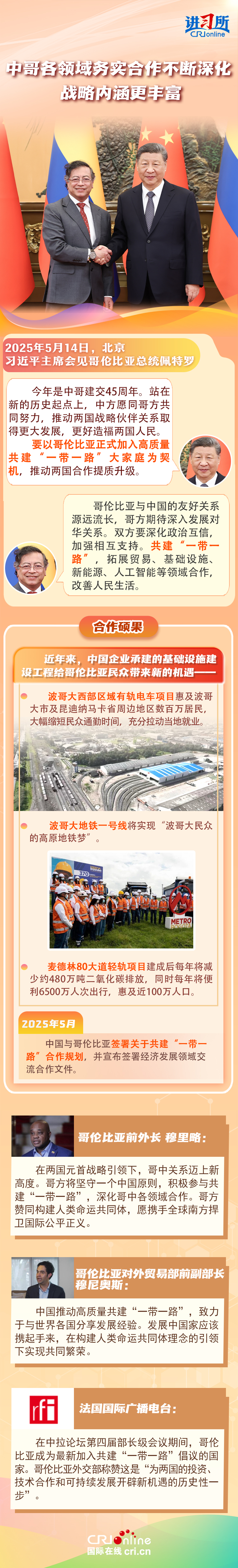 習近平主席在這三場雙邊外事活動中,均提到了共建“一帶一路”倡議:“深化‘一帶一路’倡議同巴西發展戰略有效對接”“要以哥倫比亞正式加入高質量共建‘一帶一路’大家庭為契機,推動兩國合作提質升級”“雙方要落實好共建‘一帶一路’合作規劃”……10多年來,在習近平主席親自擘畫和推動下,共建“一帶一路”從中國倡議走向國際實踐,取得了實打實、沉甸甸的成就。