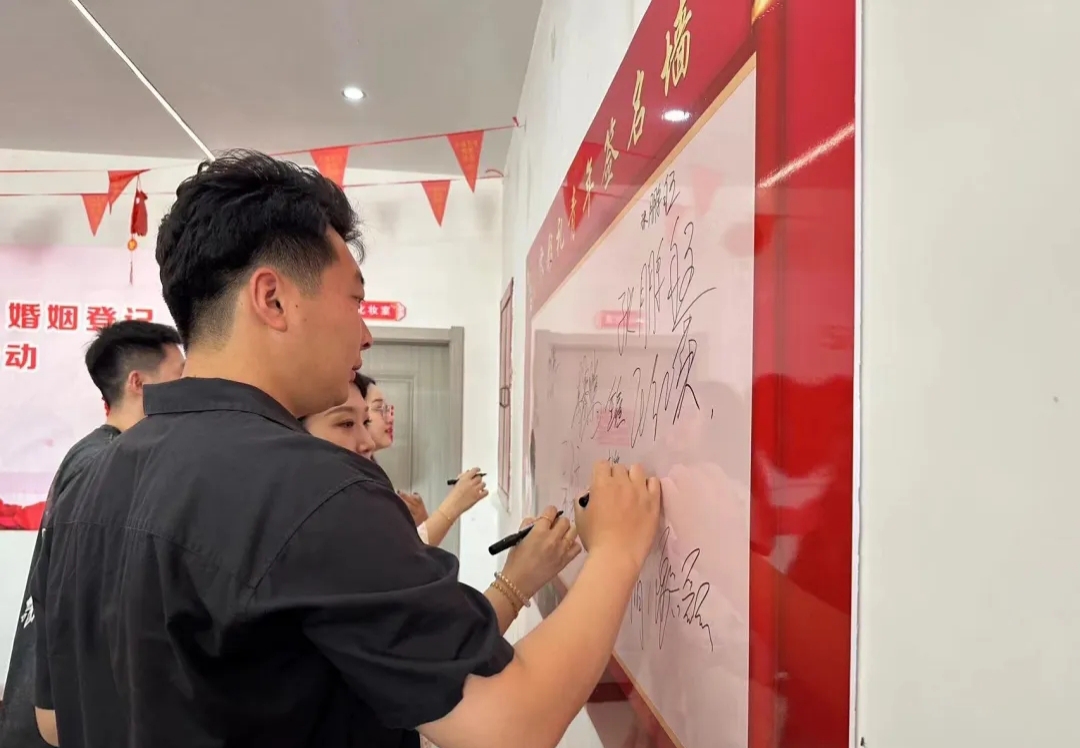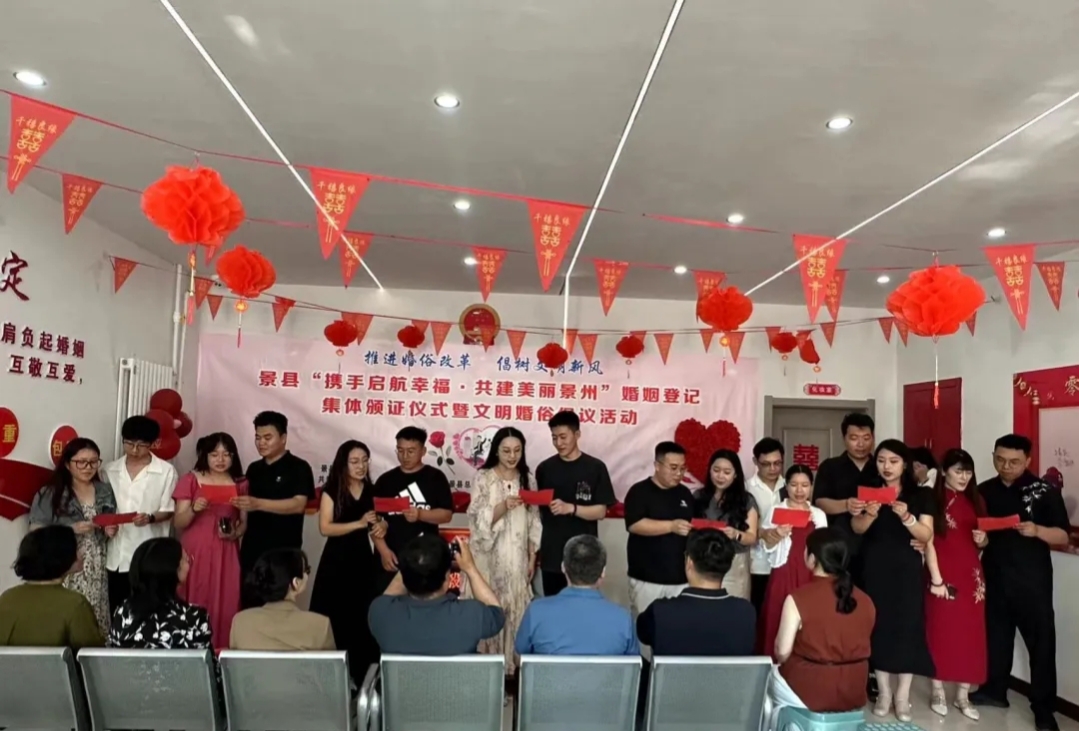 此次活動由景縣民政局主辦,景縣文明辦、共青團景縣縣委、景縣婦女聯合會、景縣總工會、景縣社會工作部協辦,旨在引導廣大青年要以實際行動踐行婚俗新風,倡導婚事簡辦,弘揚社會正氣,樹立時代新風。活動中,景縣民政局相關負責人向新人們表達美好祝福,強調婚俗改革對于社會文明進步的重要意義,鼓勵新人們樹立正確婚姻觀、價值觀,傳承良好家風,為構建文明和諧家庭貢獻力量。新人們整齊站立,在莊重而溫馨的氛圍中,鄭重宣讀結婚誓言。溫柔的話語,一字一句都飽含著對彼此的承諾與對未來生活的美好期許。在眾人期待的目光中,領導們為新人們頒發結婚證書,并送上鮮花與祝福。活動現場還設置了零彩禮倡議簽名環節,新人們紛紛在簽名墻上鄭重簽下名字,以實際行動抵制陳規陋習,用文明、健康的婚俗方式,引領時代新風。