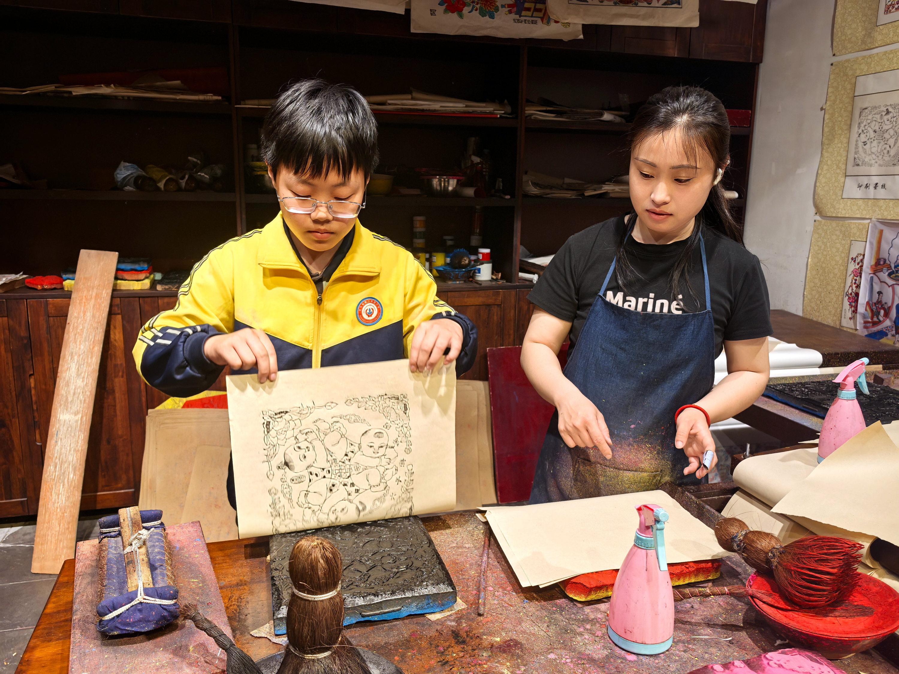 最具趣味性的年畫印制體驗環節中,孩子們化身“小工匠”,在專業老師指導下,手持鬃刷、木版,依次完成刷墨、鋪紙、按壓等步驟。當帶著墨香的年畫作品在手中成型時,現場歡呼聲此起彼伏,孩子們捧著“作品”,自豪之情溢于言表。