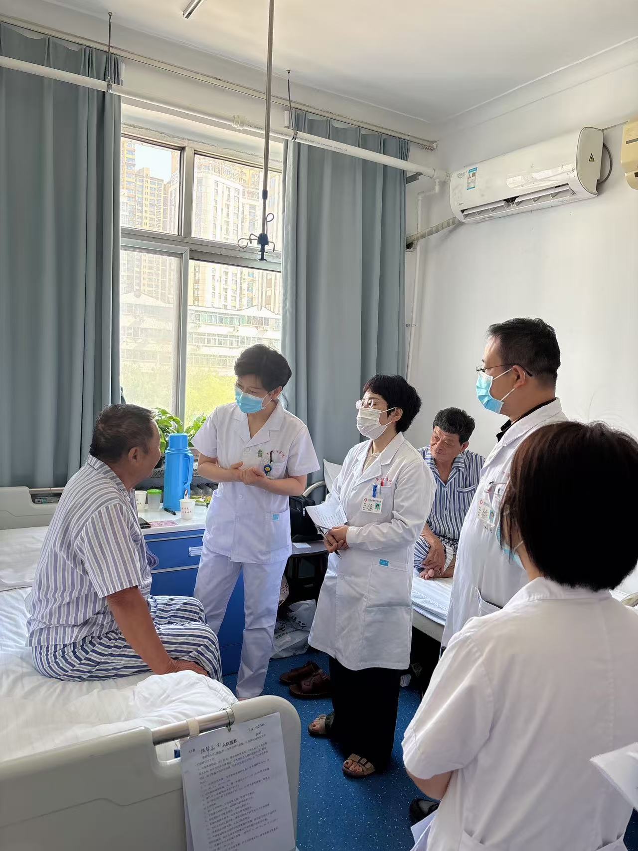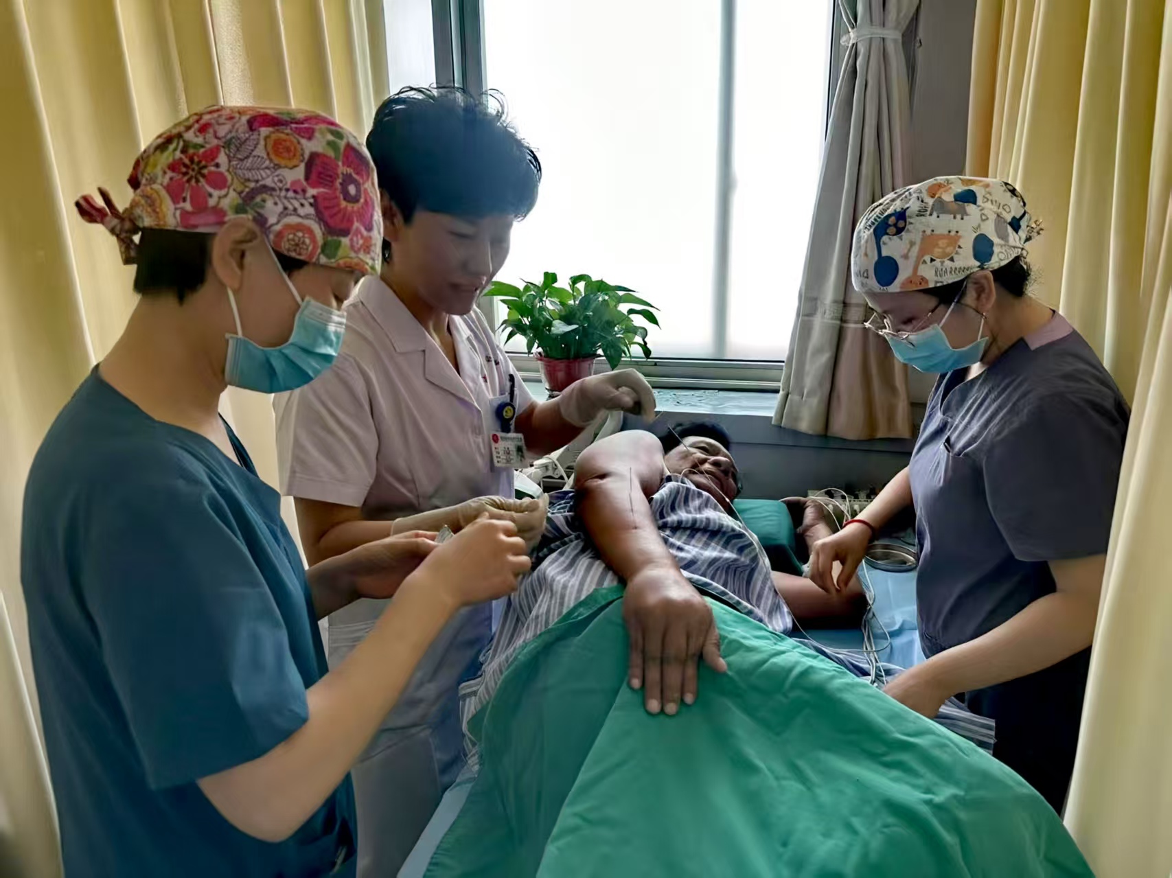 溫馨的病房里,醫護人員正一邊仔細調試著理療設備,一邊用帶著暖意的話語與臺灣患者親切交談。窗外喧囂鼎沸,窗內溫情脈脈,兩重天地相映成趣,勾勒出“兩岸一家親”的溫馨畫面。