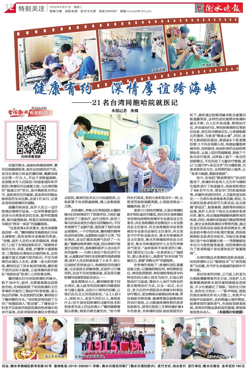 初夏的衡水,綠意如濤漫卷湖畔,繁花似錦綴滿街巷。就在這如畫的時節里,來自臺灣省云林縣的魏明輔、魏廖麗珠夫婦等一行21人,不遠千里跨越海峽,來到衡水市人民醫院(哈勵遜國際和平醫院)疼痛科開啟康復之旅。與臺灣同胞的“健康之約”背后,是對精湛醫術的認可、是醫患信任的溫暖,更是兩岸同胞血脈相連的生動注腳。這是5月20日,記者走進哈院疼痛科的感觸。