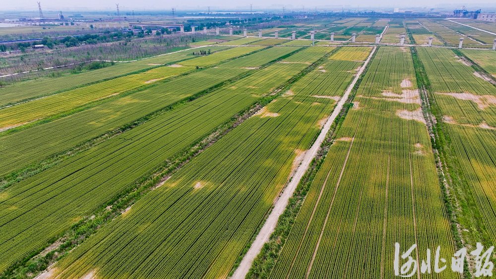 5月22日,航拍渤海新區黃驊市舊城鎮仙莊片區旱堿地麥田。河北日報記者李佳澤攝
