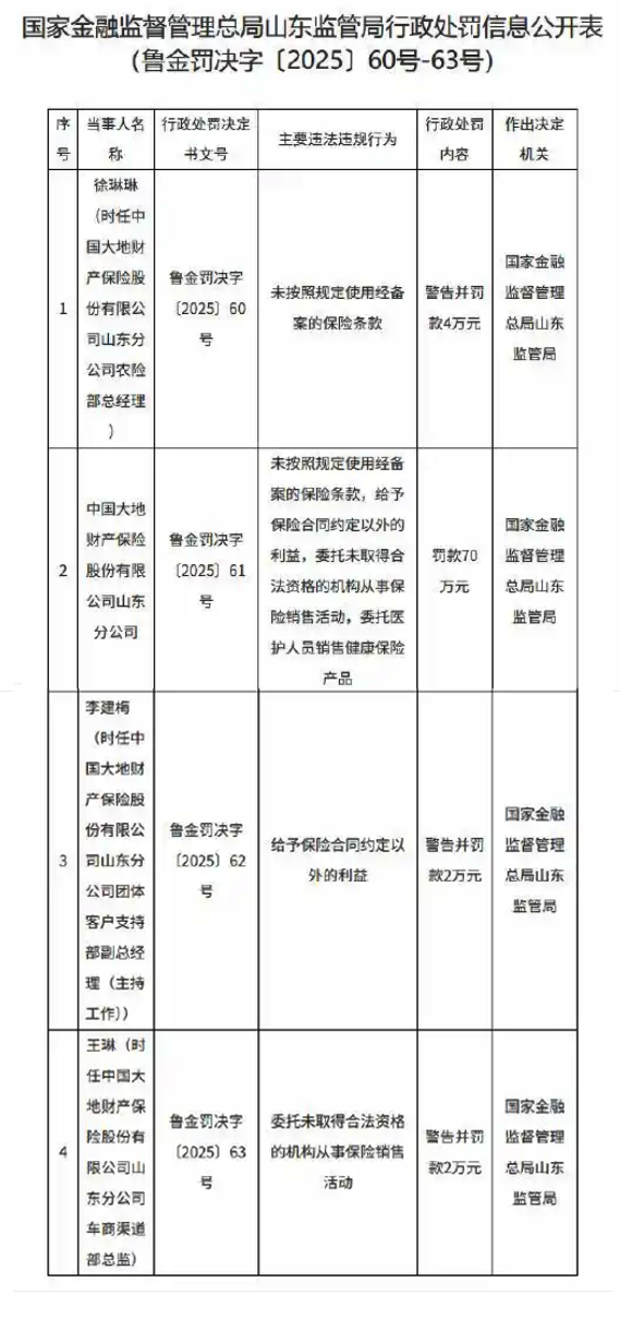 6月3日,據國家金融監督管理總局山東監管局行政處罰信息公開表顯示,中國大地財產保險股份有限公司山東分公司因未按照規定使用經備案的保險條款,給予保險合同約定以外的利益,委托未取得合法資格的機構從事保險銷售活動,委托醫護人員銷售健康保險產品,被罰款70萬元。