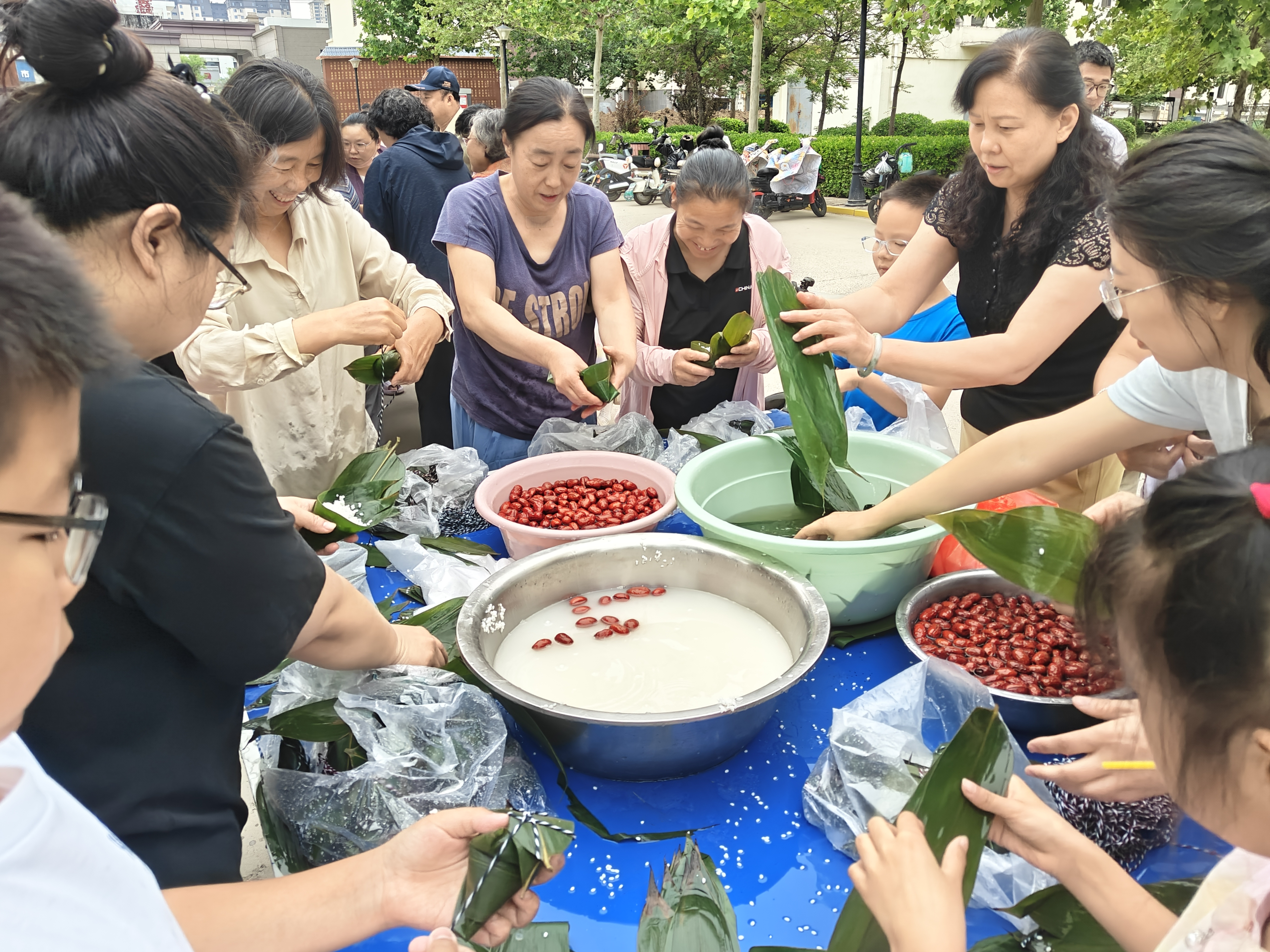 活動現場居民們圍坐在一起,捋粽葉、填糯米、壓實、捆扎,不少長輩動作嫻熟、技藝嫻熟,熱心地向年輕人傳授包粽子的技巧,一片粽葉一縷溫情,鄰里間的情感在歡笑中悄然升溫。