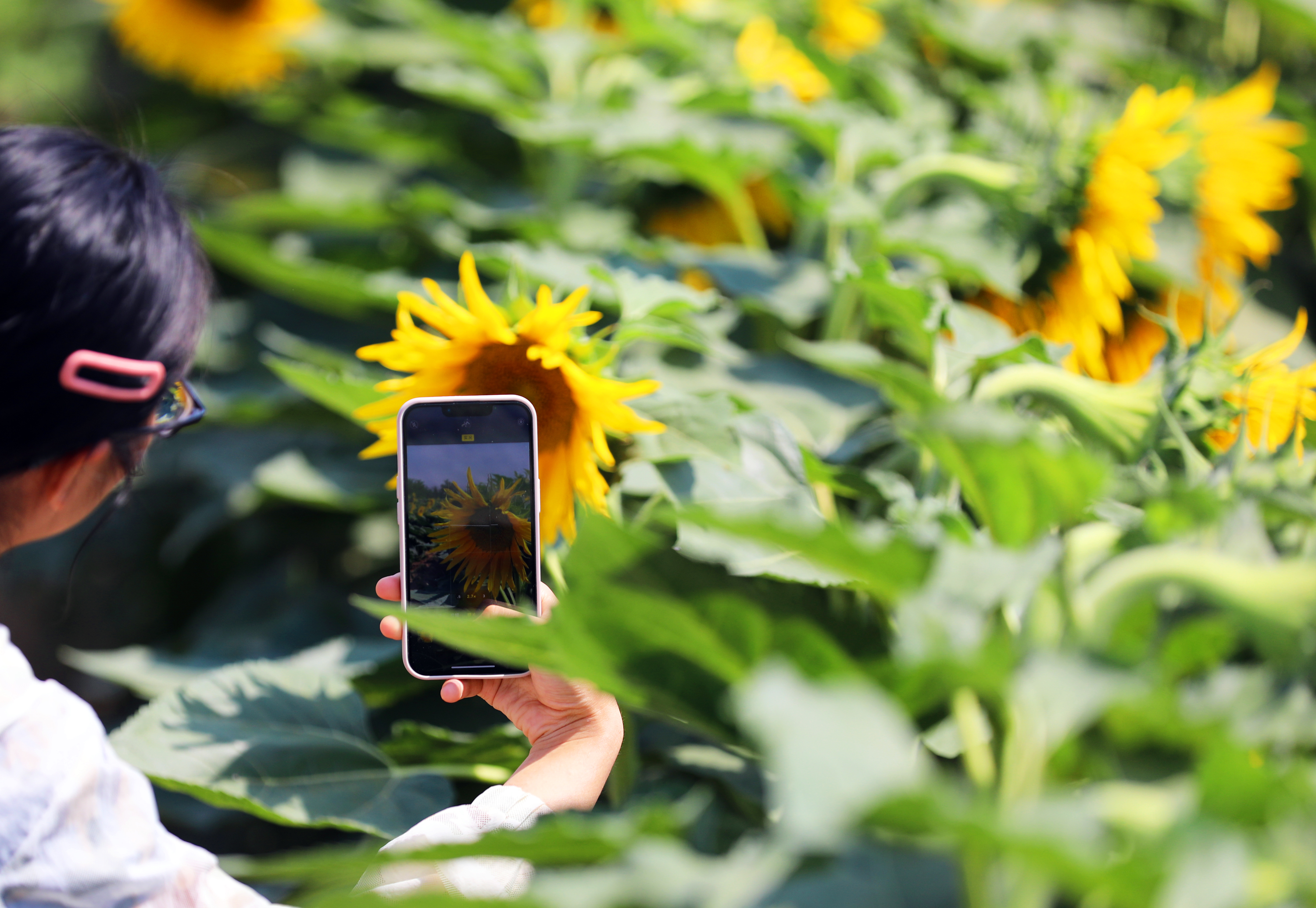 “在社交平臺刷到這里的打卡視頻后,就計劃帶孩子來親近自然?!笔忻窭钆恳贿厼楹⒆优恼?,一邊分享感受,“遠離城市的車水馬龍,置身這片向陽花海,身心都得到了治愈。隨手拍攝的畫面發在抖音上,收獲了很多點贊?!?/p>