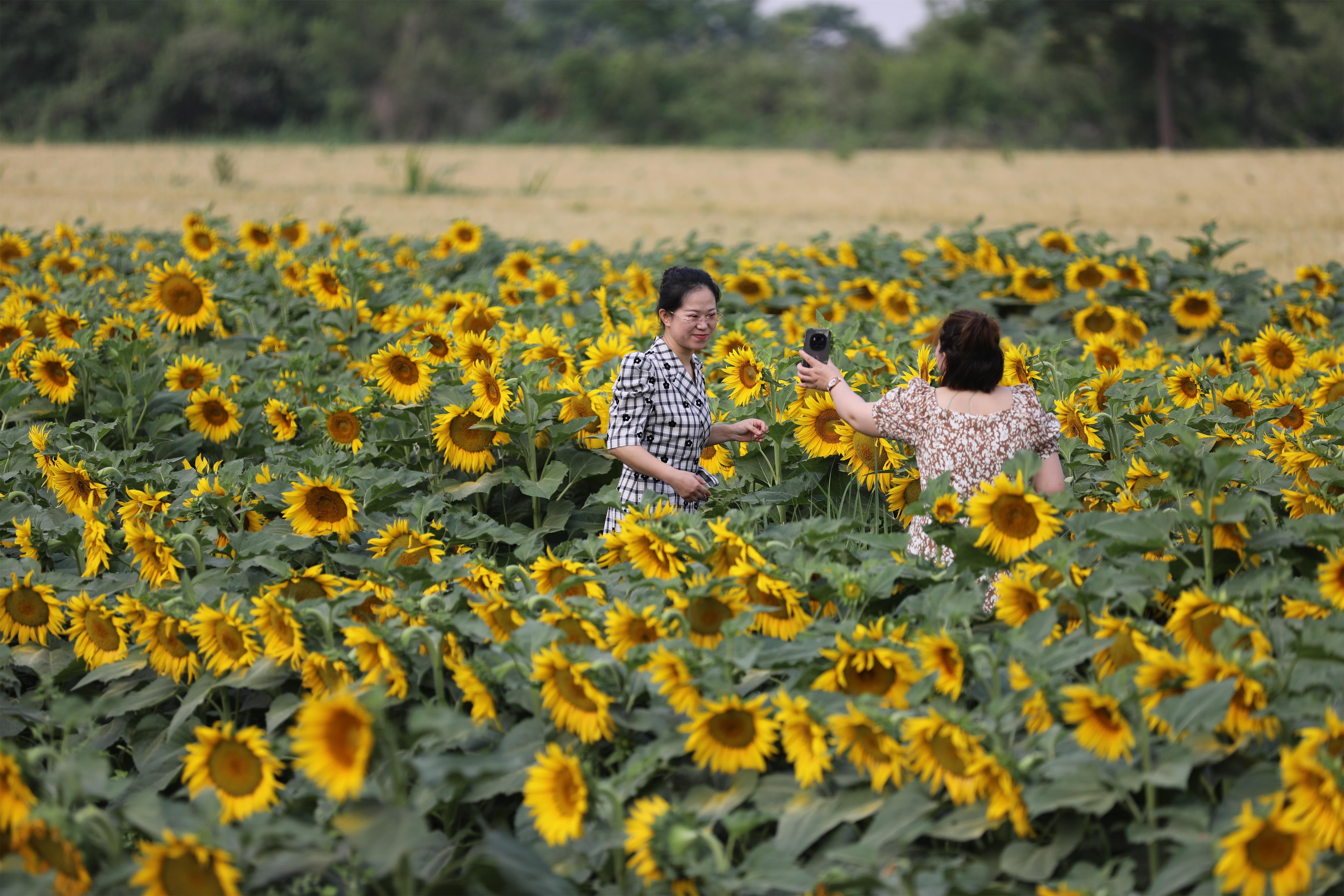 6月8日,沿著東湖大道濱湖新區路段看到,道路西側連片的向日葵向陽盛放。成片花田宛如金色海洋,隨風泛起層層漣漪,馥郁花香撲面而來。繁茂生長的向日葵猶如一張張燦爛笑臉,在麥收時節勾勒出充滿希望的豐收圖景,吸引眾多市民游客駐足觀賞。