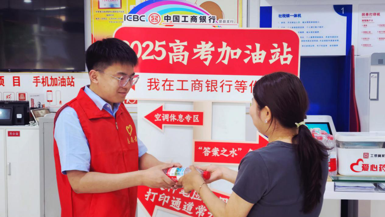 來自驛站的祝福。作為一位考生家長,劉梅在開考第一天就因為炎熱和緊張感到中暑,她在愛人攙扶下走進不遠處的工行景縣支行營業室,大堂經理小馬趕緊把劉梅扶到休息區坐下,把提前準備好的礦泉水拿給劉梅的愛人。劉梅緩和下后,認真打量了一下自己面前的高考愛心服務驛站,暖心的“2025高考加油站”和“我在工商銀行等你”等字標映入眼簾。這時,大堂經理小馬也再次來到劉梅身邊詢問情況,劉梅一邊表示感謝一邊指著驛站的“答案之水”的牌子說,不僅身體的不適緩解了,喝了水還對考場中的孩子充滿信心。“母子連心,您有信心,孩子也會感應得到的,狀態就能更好地發揮出來,筆下生輝、有夢必達!”小馬的祝福讓劉梅焦慮的心終于緩和下來,“是的,我相信自己的孩子。”