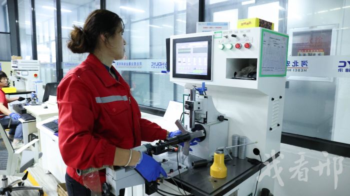 ↑河北宏達隆業軸承有限公司,工作人員正在對高端靜音深溝球軸承進行產品測試。崔延鑫攝