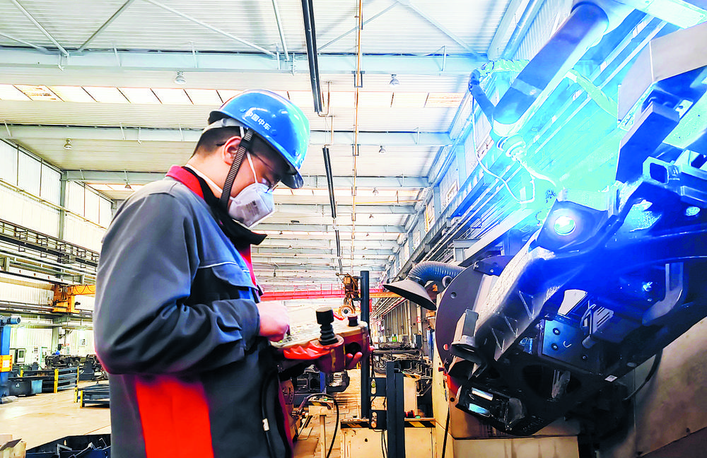 中車石家莊車輛有限公司工作人員操作焊接機(jī)器人,進(jìn)行貨車側(cè)架焊接。