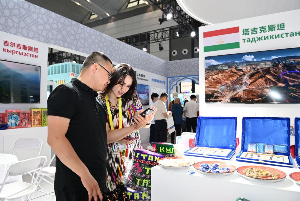 △2025年5月21日,在第九屆絲綢之路國際博覽會暨中國東西部合作與投資貿易洽談會絲路優品展上,參觀者了解塔吉克斯坦商品。