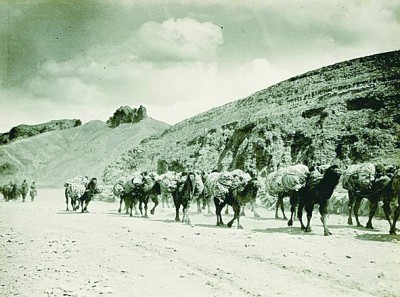 20世紀(jì)二三十年代,張庫(kù)大道上馱著皮毛的駱駝隊(duì)。圖片來(lái)源:張庫(kù)大道博物館