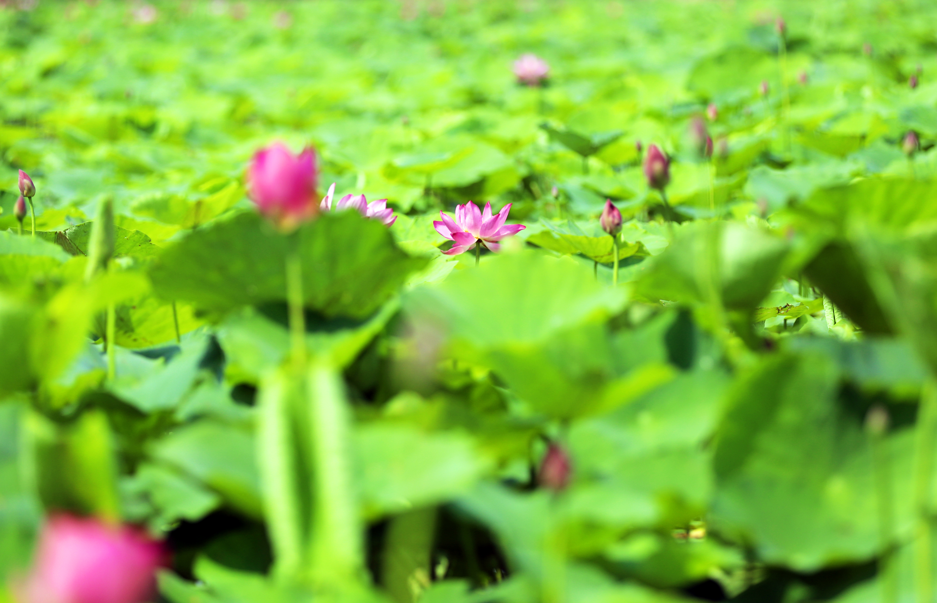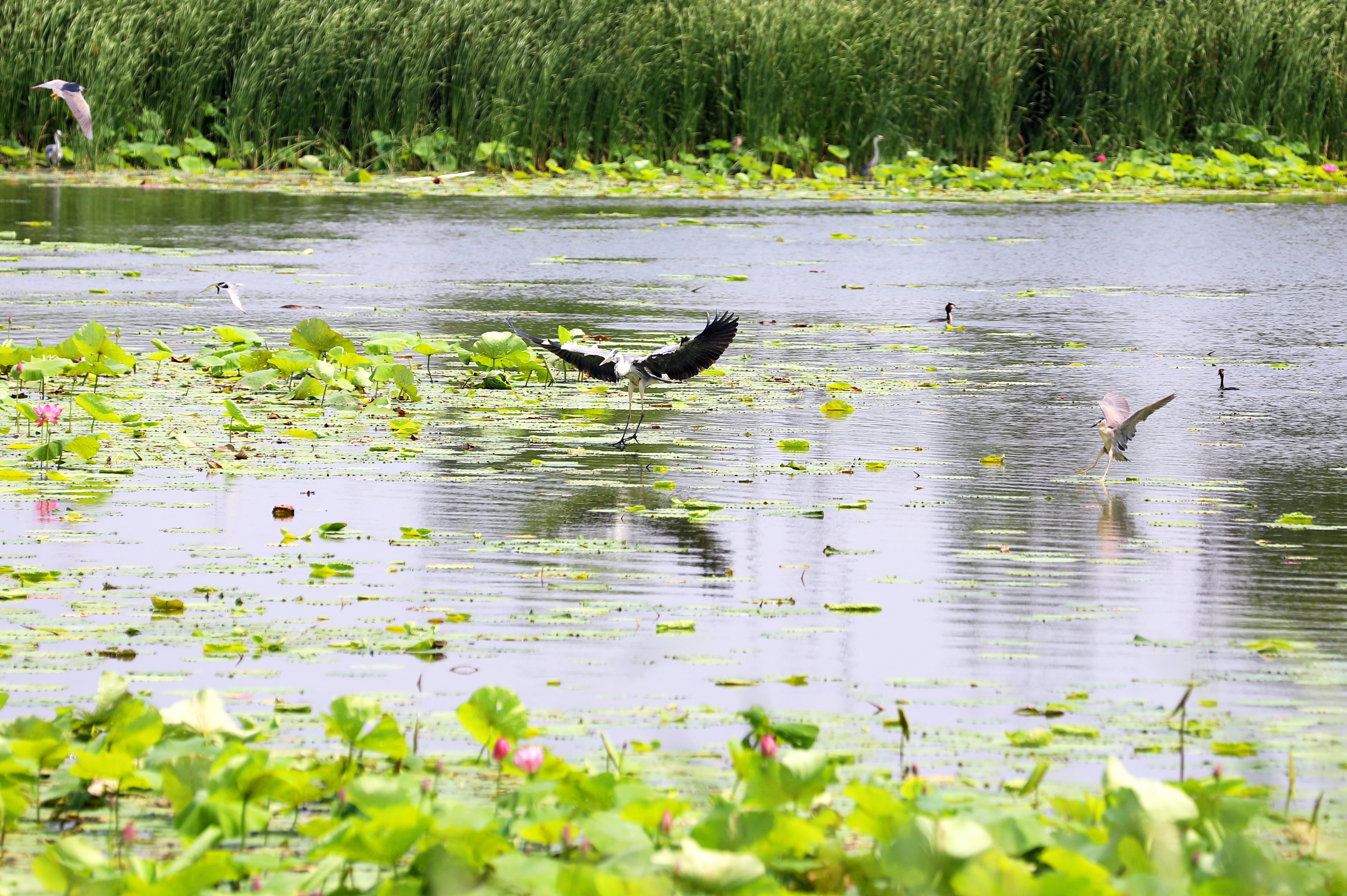 當微風拂過,滿池荷花搖曳生姿,或輕柔擺動,或熱烈舒展,與大片翠綠荷葉相互呼應。荷葉如傘,層層疊疊在風中翻涌成浪,花影綽約,儼然一幅鮮活靈動的水墨畫卷。白鷺、池鷺等鳥兒,時而輕盈掠過水面,激起圈圈漣漪,時而駐足枝頭,悠然梳理羽毛,為靜謐的荷花園增添了無限生機與野趣。