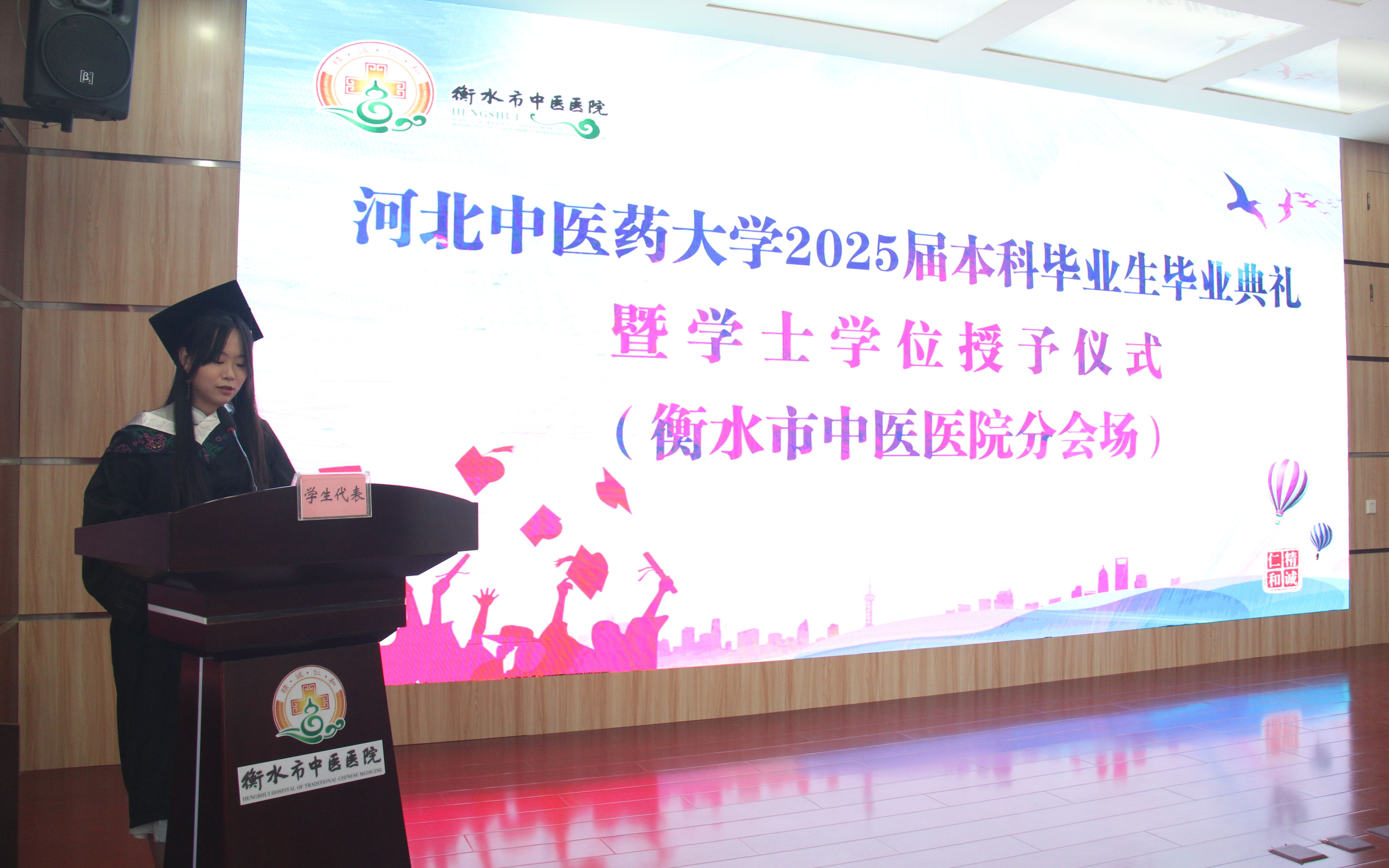“田院長的話讓我想起實習時,他帶著我們查房時躬身問診的場景。'持敬守真'不是口號,而是要用一生去踐行的準則。” 畢業生代表武佳一飽含深情地回顧了在醫院和學校的學習生活與成長點滴,真摯表達了對學校和醫院精心培養、諄諄教誨的感激之情。她表示將不忘初心、傳承中醫精神,在遠航的道路上堅守信念、銘記師訓,學以致用、回報母校、服務社會。