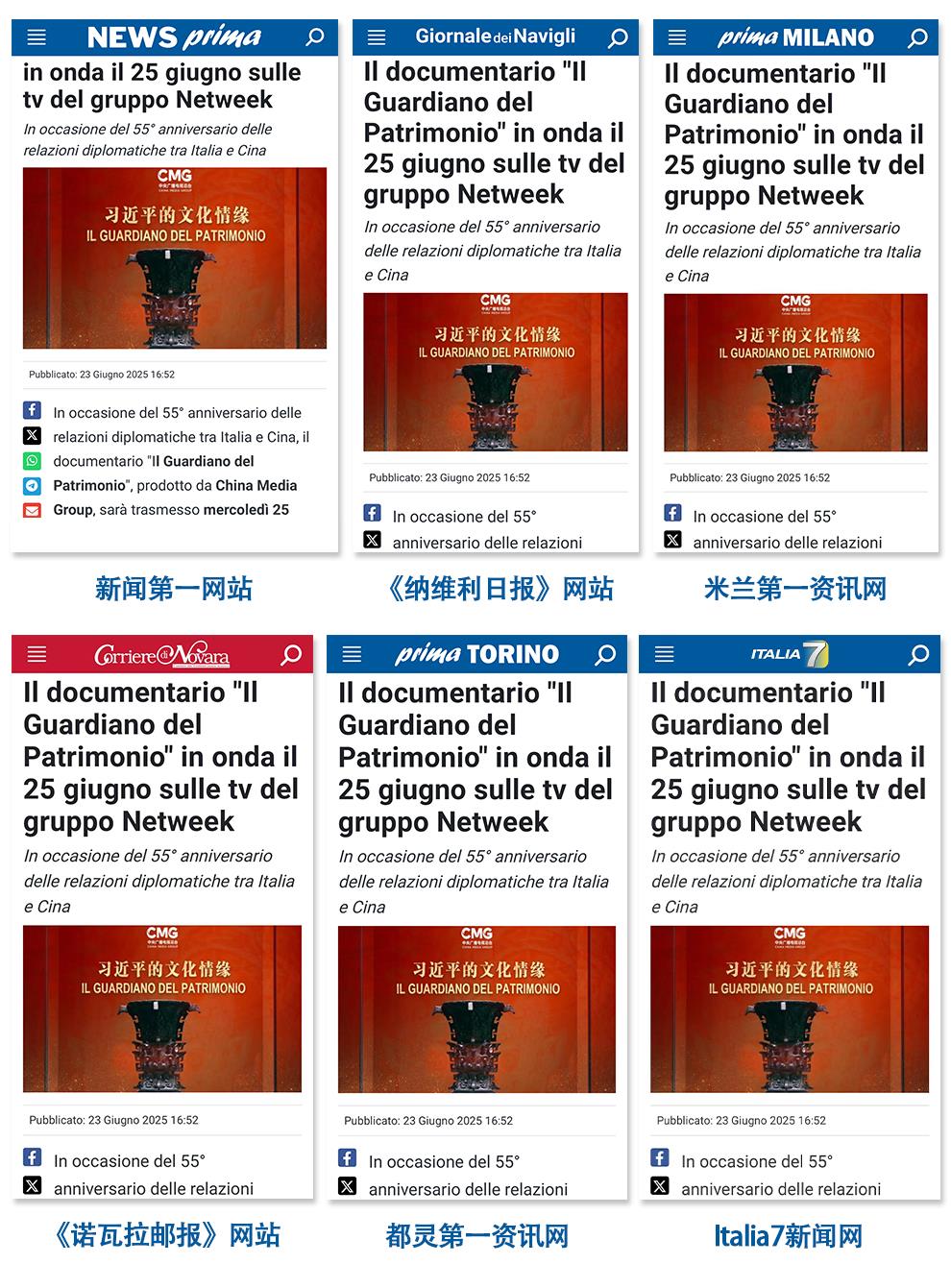 6月25日起,《習(xí)近平的文化情緣》在意大利阿爾瑪電視臺、多納電視臺、旅游電視臺、拉齊奧電視臺、倫巴第城市電視臺、羅馬科羅納廣播電視臺、米蘭帕維亞電視臺,《米蘭財經(jīng)報》網(wǎng)站等30多家意主流媒體平臺陸續(xù)上線播出。
