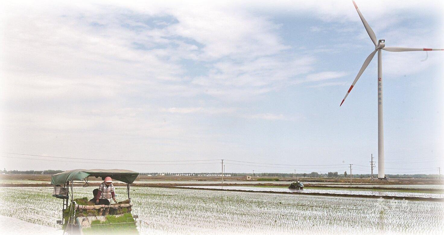 昌黎縣劉臺莊鎮東新立莊村農民在田間使用農機插秧。