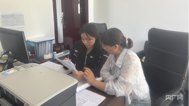朱一然(左一)幫同事整理材料(央廣網發 受訪者供圖)
