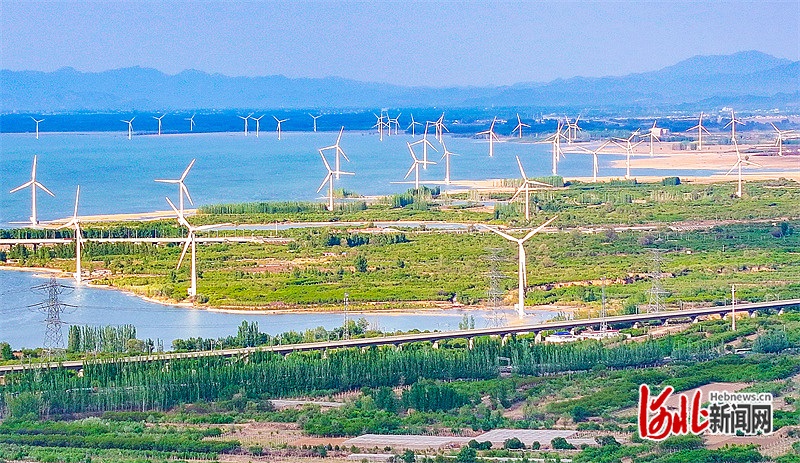 近日拍攝的官廳水庫國家濕地公園內(nèi)的風電設施。 河北日報記者 耿 輝攝