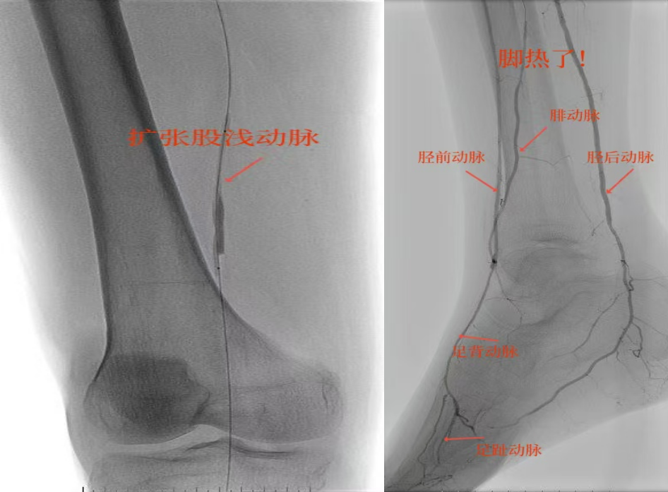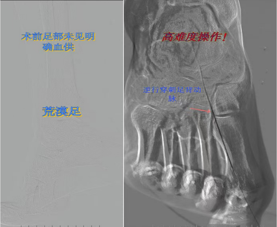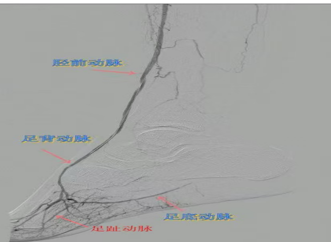 78歲男性患者,糖尿病合并高血壓、腦梗塞,右足持續(xù)疼痛伴冰涼發(fā)紺3個(gè)月。入院CTA顯示其右側(cè)股淺動(dòng)脈全程閉塞,膝下三支動(dòng)脈均閉塞。醫(yī)療團(tuán)隊(duì)在局部麻醉下,再次巧妙應(yīng)用“逆向開(kāi)通技術(shù)”,經(jīng)脛后動(dòng)脈——足底弓逆向開(kāi)通足背動(dòng)脈及脛前動(dòng)脈。術(shù)后患者右足皮溫即刻回升,疼痛消失。術(shù)后結(jié)合中藥外治(換藥、熏洗、去腐生肌膏外敷)加速創(chuàng)面愈合,患者已順利出院。