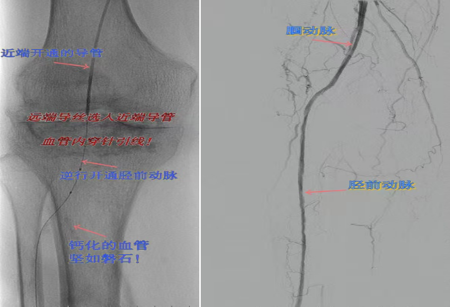兩例患者共同凸顯三大高難度治療挑戰(zhàn):1.患者高齡且基礎(chǔ)病復(fù)雜;2.血管全程多節(jié)段閉塞、鈣化程度嚴(yán)重;3.常規(guī)順向開(kāi)通路徑已被完全阻斷。團(tuán)隊(duì)果斷采用遠(yuǎn)端逆行穿刺技術(shù),在纖細(xì)的足踝部血管建立治療通道,實(shí)現(xiàn)“逆向破冰”。