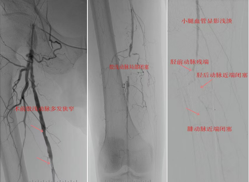 影像檢查:CTA顯示右側(cè)股淺動(dòng)脈全程閉塞,膝下三支動(dòng)脈(脛前、脛后、腓動(dòng)脈)完全閉塞。